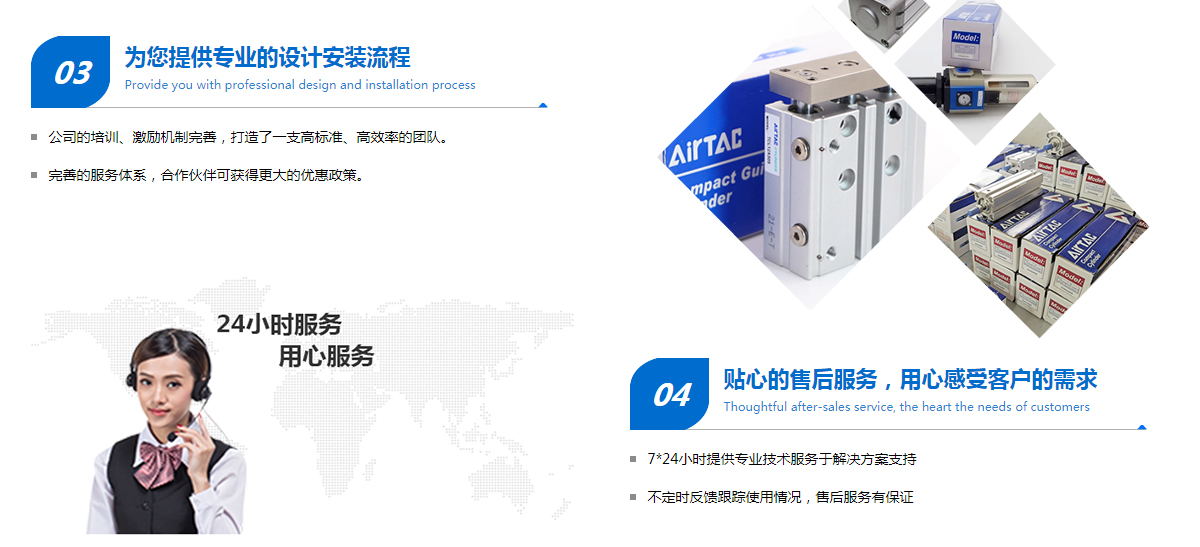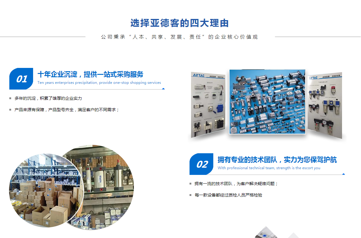 天津中工科進智能裝備有限公司自成立以來,依托優越的地理優勢,立足三北,輻射全國,形成了穩定的銷售網絡,公司專業從事臺灣亞德客AIRTAC品牌氣動元件,北方地區的銷售及售后服務等。產品包含:亞德客AIRTAC氣動元件,亞德客AIRTAC氣缸,亞德客AIRTAC電磁閥,亞德客AIRTAC氣控閥,亞德客AIRTAC氣動旋轉夾爪,亞德客AIRTAC過濾器,亞德客AIRTAC夾緊氣缸,亞德客AIRTAC氣動機械夾爪,亞德客AIRTAC真空吸盤,亞德客AIRTAC接頭氣管輔助元件等。公司團隊立足于氣動領域內的技術咨詢、技術服務,設有專門的銷售服務部,擁有完善的銷售服務體系,可在售前、售中和售后的各個環節為用戶提供全面服務,為您解決氣動方面各項疑難問題。